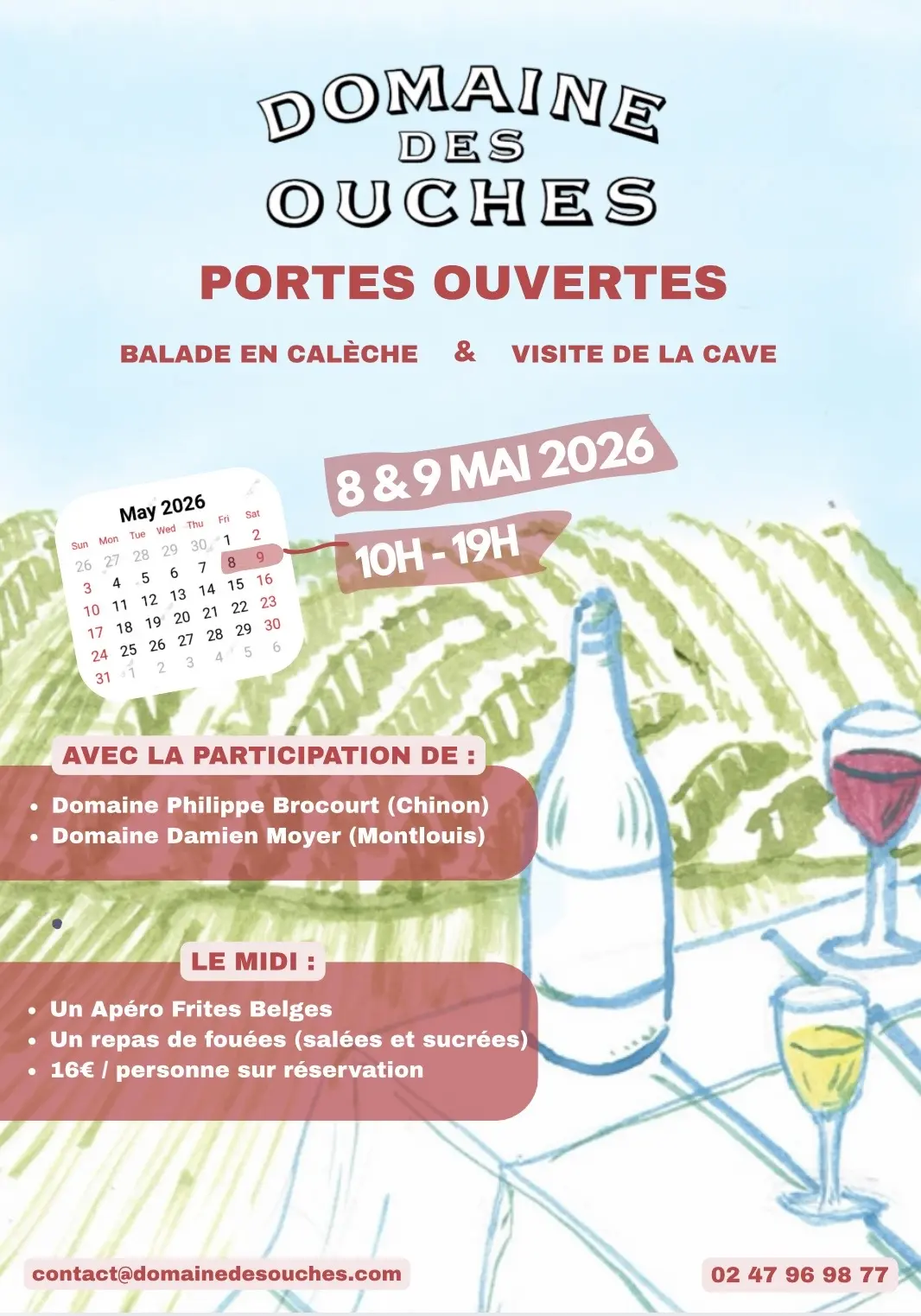 Venez partager un moment de convivialité pendant ces Portes Ouvertes. Tout au long de la journée vous pouvez visiter notre cave troglodyte, déguster nos différentes cuvées et vous balader en calèche dans les vignes. Le midi un repas avec des fouées est proposé pour 16€ par personne sur réservation.