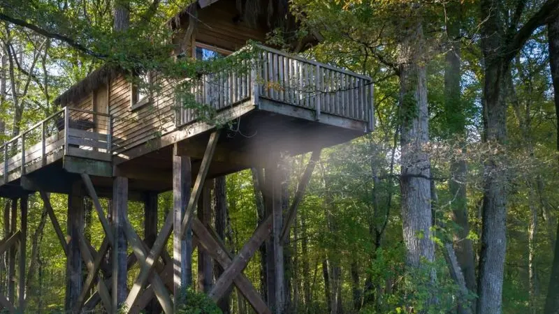 Ces cabanes dans les bois sur pilotis disposent d'un balcon donnant sur le parc avec une vue imprenable sur le château, une salle de bains privative et de toilettes.