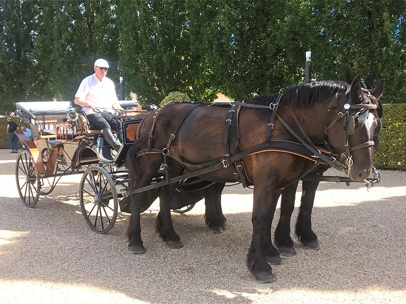 En cas de pluie, la calèche possède une capote qui vous abritera du mauvais temps. Coupe-vent, couverture à disposition en cas de besoin.