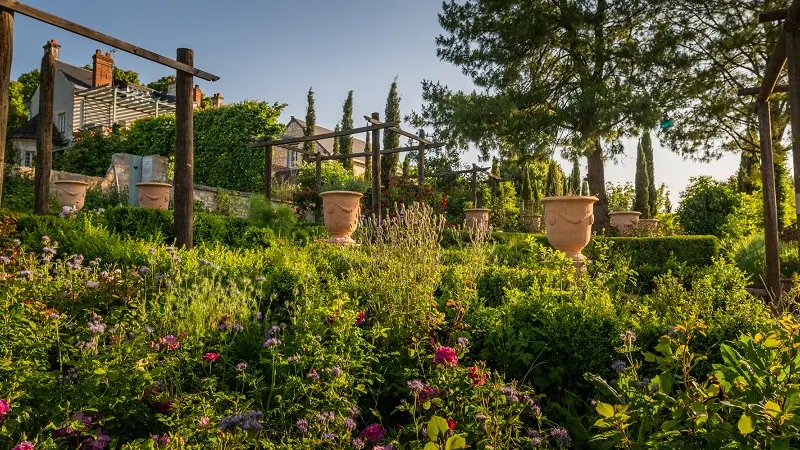 Nichés dans le coteaux de l’Indre, les Jardins Haute Couture forment un délicat écrin de verdure et de senteurs autour d’une ravissante demeure, anciennement celle de Gilles Chauvelin, illustre tailleur de pierre et grand ami de Max Ernst. Les jardins en terrasses dévoilent un à un leurs secrets dans un dédale de pergolas, de topiaires en if et en buis, de bassins, de roseraies et de massifs richement colorés.